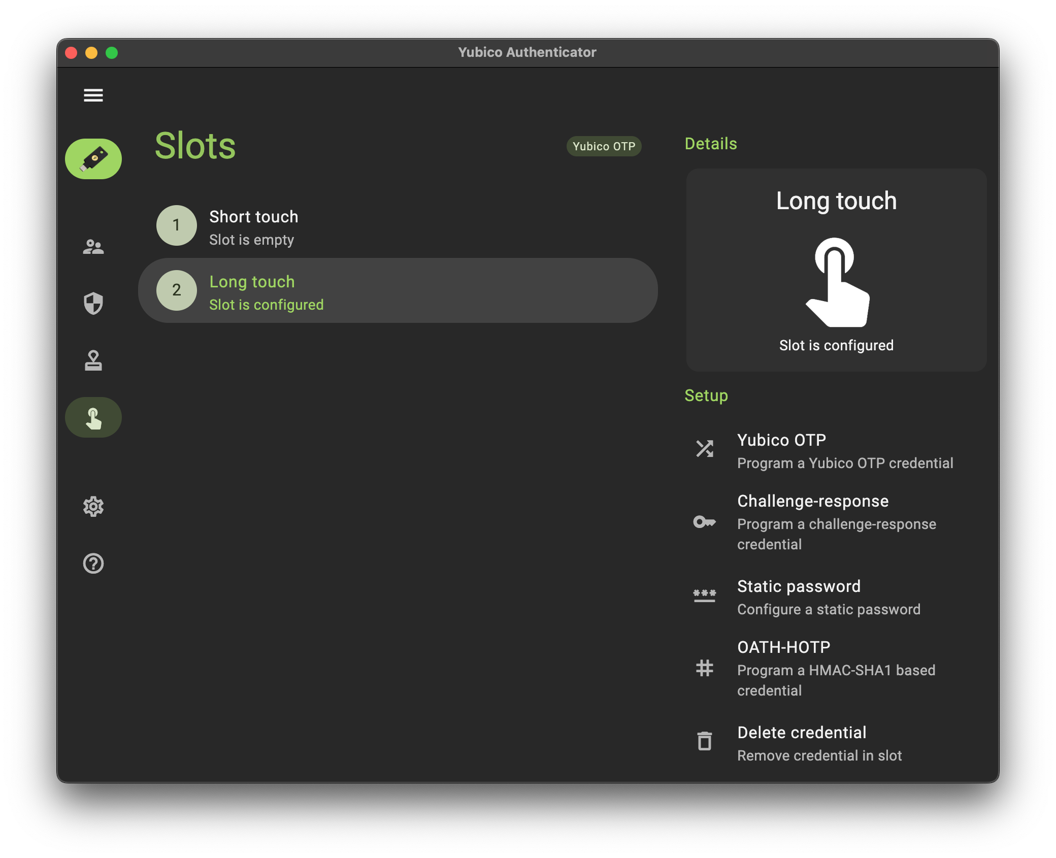 Note that, when setting up the challenge-response algorithm, you will be asked to enter a secret key. This key is at the heart of this method. Any Yubikey that has the same key set, will be able to generate the same responses to your challenges. Make sure it remains secret! During setup you can also determine if the key requires to be touched for the response to be generated.